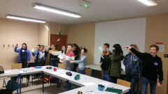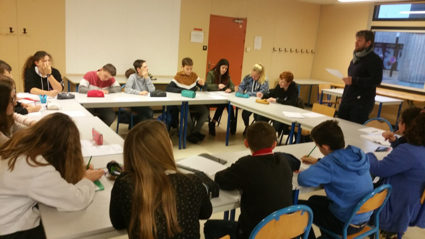 Vendredi 22 novembre 2019, l’ensemble des délégués du collège a participé à une matinée de formation dans la grande salle des associations, prêtée la mairie. Elle était encadrée par M. Kerbiriou, professeur d’histoire-géographie et d’EMC, M. Séac’h, professeur documentaliste, Mme Lemée, principale, et Guillaume Dilasser, animateur jeunesse du centre PEP Keravel à Plougasnou. Un jeu de l’avion pour faire connaissance et s’exprimer, un jeu de rôle pour appréhender le conseil de classe, une présentation des différentes instances par les délégués élèves eux-mêmes… Une matinée active et riche pour tous !